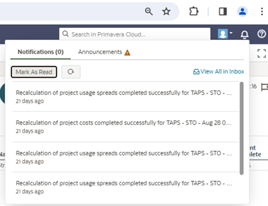 As an Oracle Primavera Cloud (OPC) user you have an inbox in the software. Have you had a look at the information available there? To access your inbox, click the View Notifications icon and then click View All in Inbox.