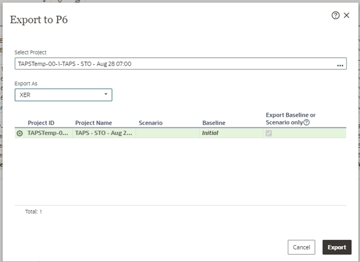 The Export to P6 dialog now allows selection of baselines and scenarios when Export format XER or Compressed XER is selected. The Export Baseline or Scenario Only is auto checked and read only when a baseline/scenario is selected.