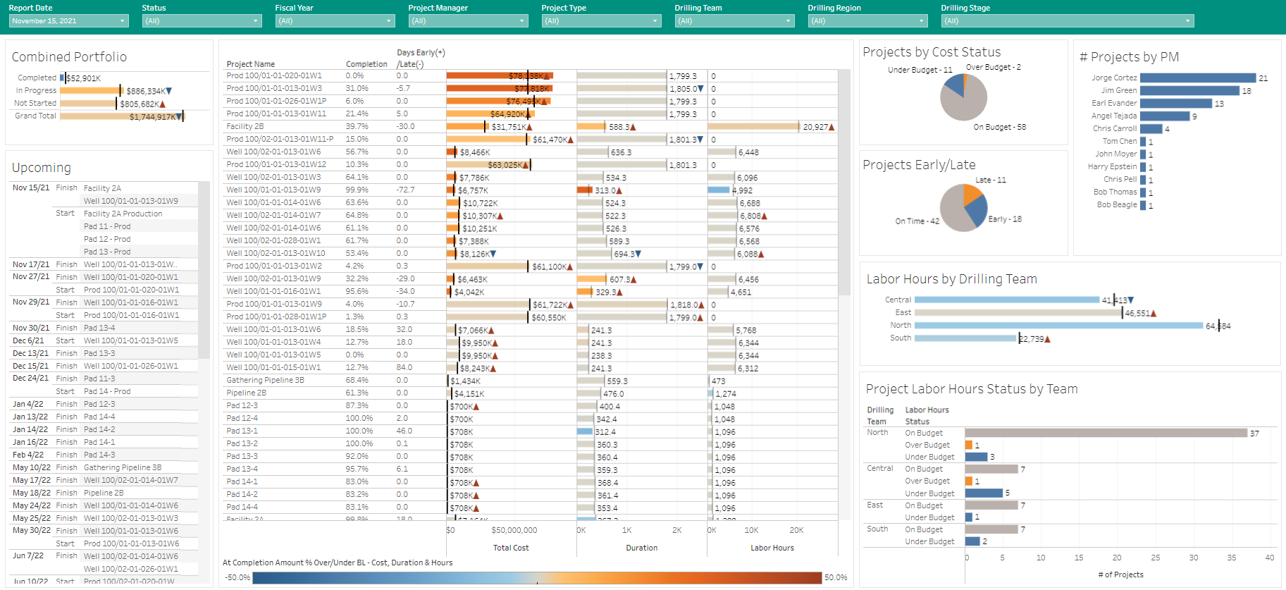 In P6-Reporter, the Portfolio Summary Self-Serve Dashboard provides easy access to portfolio level information. In the screen shot below, the user has summary information for all the projects in the portfolio displayed. Across the top of the dashboard are easy-to-use filters allowing the user to filter for exactly the information they need to focus on if the entire portfolio is not their current focus requirement. The report date indicates the snapshot information being displayed, and the user can filter for other snapshots if required. Previous snapshots remain available for display. Keep in mind, the snapshot process can be automated or manual.