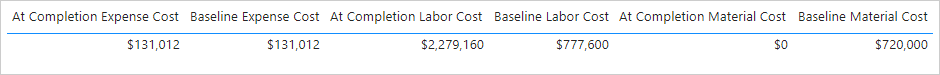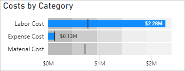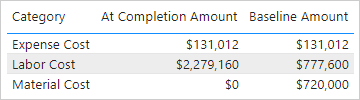 However, the visual we want to create needs three values: the category, the actual amount, and the target value. To achieve this, we have a view named ‘project cost by category’ that rearranges these columns by category like this:
