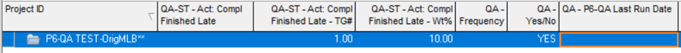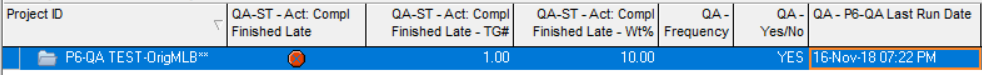 Once the P6-QA is finished running the QA-P6-QA Last Run Date column is populated as well as the QA-ST – Act: Compl Finished Late column indicator.