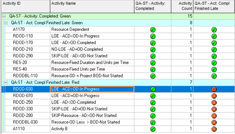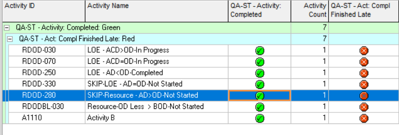 In the Activities tab the layout (below) is showing the QA-ST – Act: Compl Finished Late column as well as the QA-ST – Activity Completed columns. Each is populated with the icon produced by the check run. (Note that you control the QA-ST – Act: Compl Finished Late – TG# and QA-ST – Act: Compl Finished Late – Wt% columns by populating the tolerances you want to use in the check and overall calculation.)