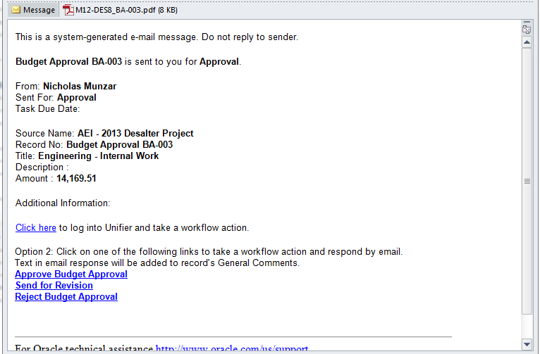 The email that is generated can be configured in Unifier uDesigner to possess specific fields from the form and therefore automatically contain the content that you desire. The external email can also have links attached; such as a link to login to Unifier to take action on the task.