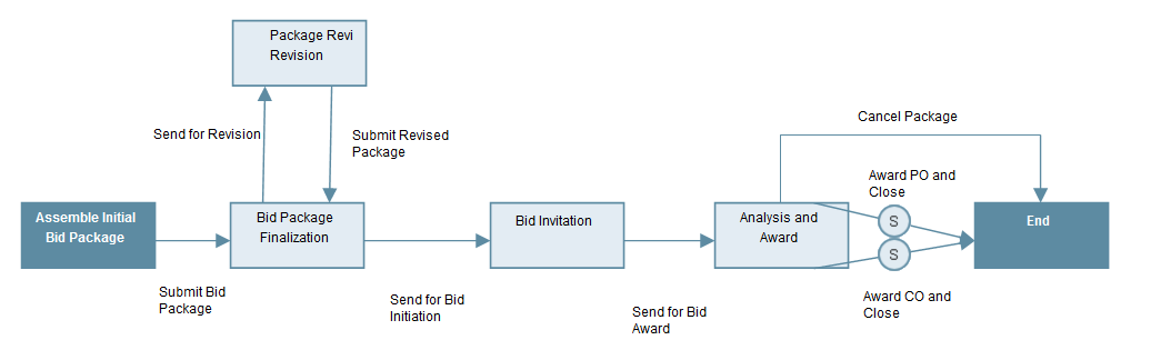 Here the request for bid business process workflow will be considered. The workflow is comprised of 3 main steps; bid package creation, bidding, and bid award. These steps can be seen in the workflow diagram of uDesigner. The steps are represented by rectangles. The arrows represent workflow actions and link the steps, as well as give the workflow a direction in which to proceed.