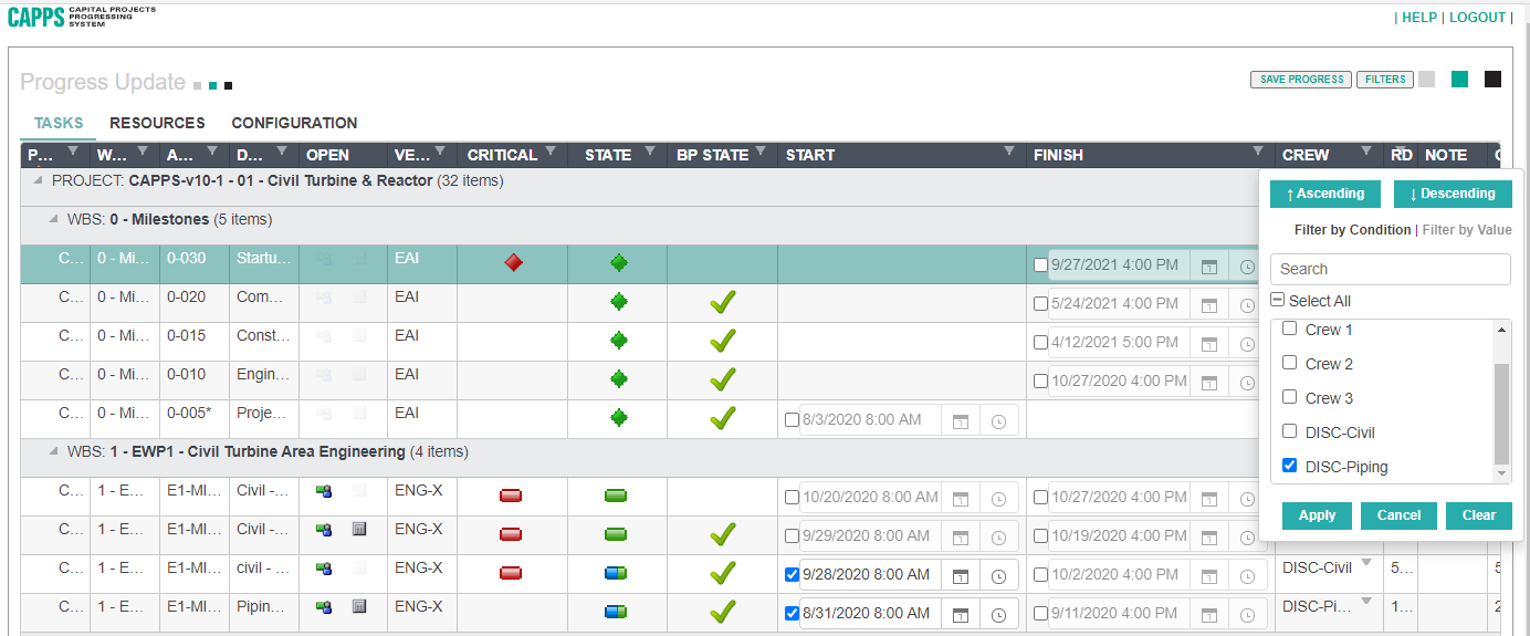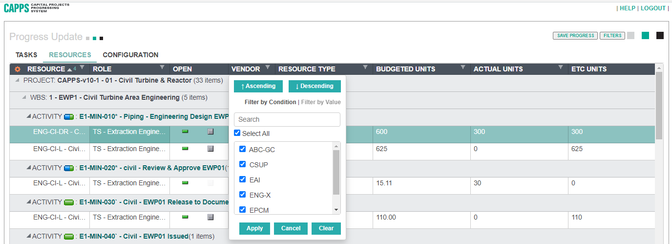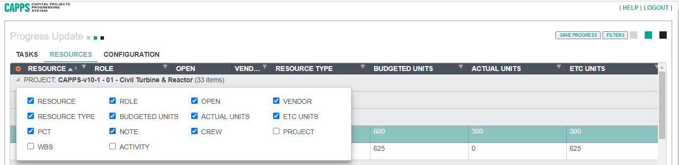 We can also filter and sort the columns. In this example, the user only requires the TASKS and RESOURCES tabs to complete updates.