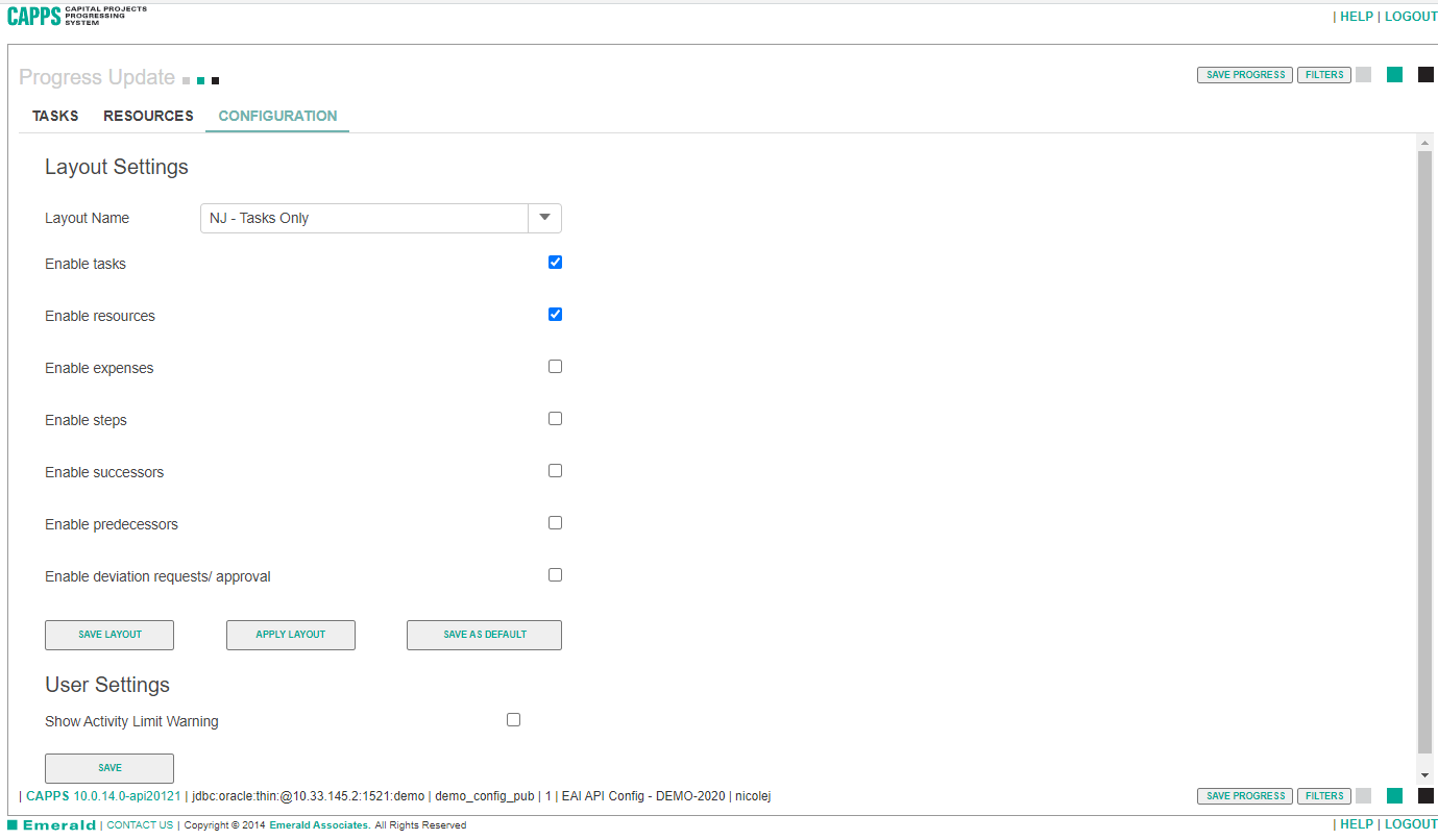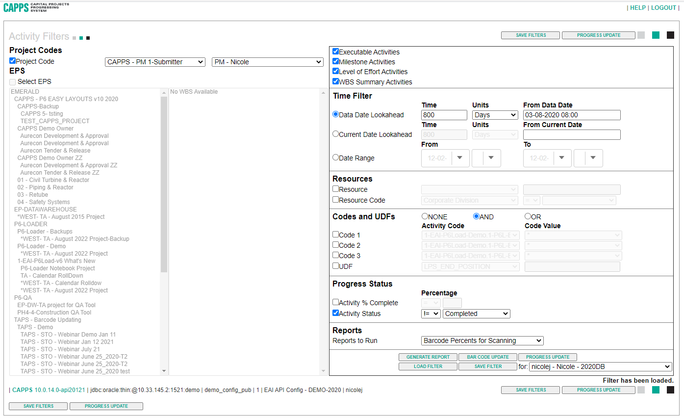 CAPPS is very customizable. The filter details control the files the user has access to. Specifications are available on the EPS level or via Project Codes, along with details of the display parameters. You can specify the type and time frame of the activities to be displayed. The use of resources and resource codes, status and Codes and/or UDFs to filter the specific project schedule elements is also available. This flexibility allows the user display to consist only of the elements in the project the user owns the updates for during the specified time frame.