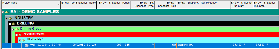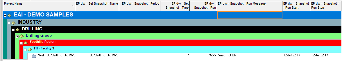 ‘P6R - Snapshot - Run’ displays PASS once the snapshot is complete. If there were any issues with the process, a message pertaining to the issue encountered will be displayed in the ‘P6R - Snapshot - Run Message' (previously 'EP-dw – Snapshot – Run Message’) column. In this case, the message is ‘Snapshot OK’ which confirms the process completed successfully.