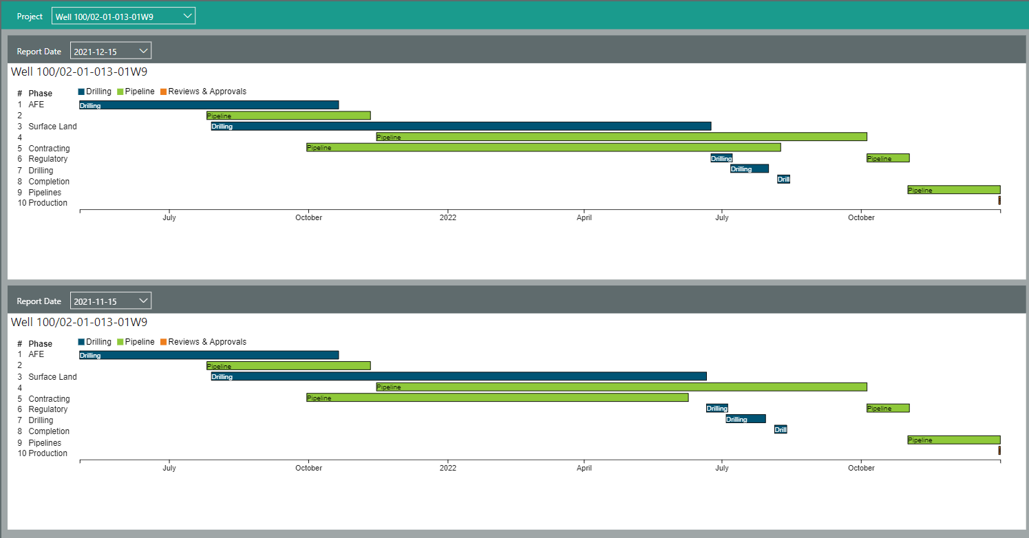 In the above Racetrack display, the bottom display is the previous snapshot of the project, and the top is displaying information from the new snapshot we just created. This allows easy comparison of data not only in the Racetrack display but with many other reports available with P6-Reporter.