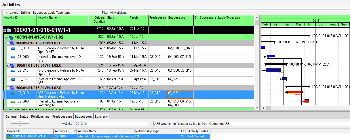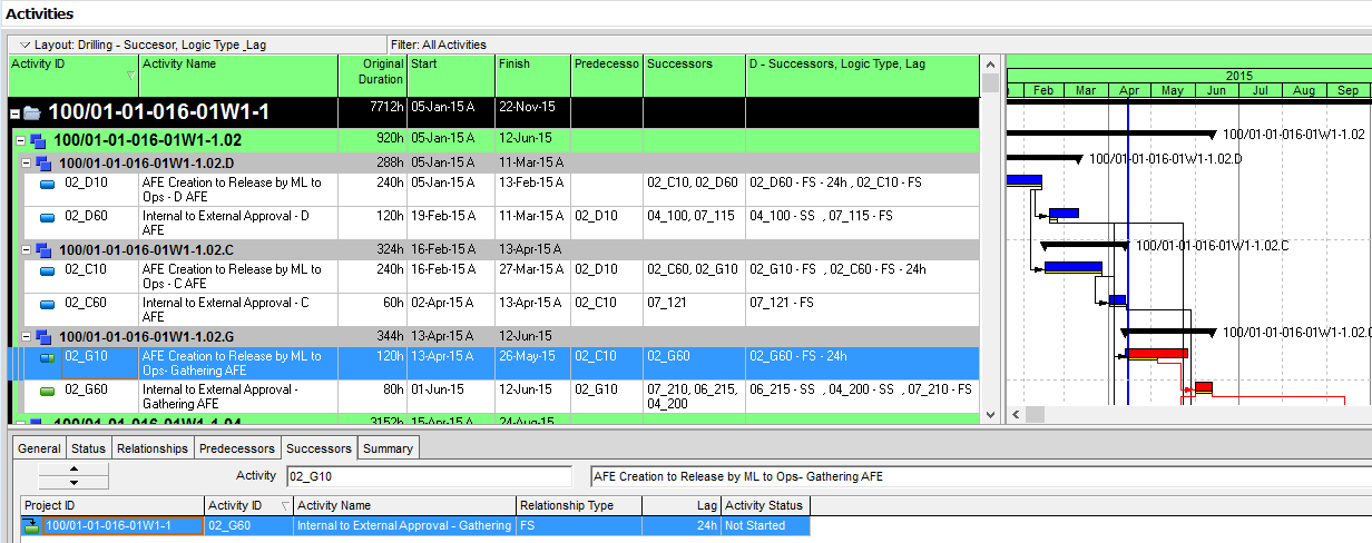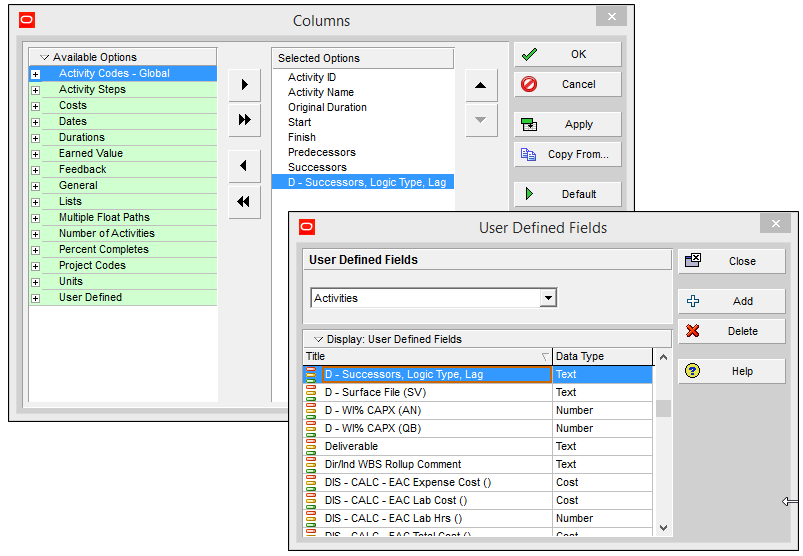 I started by creating a user defined field in Primavera P6 that will concatenate the information on Successor, Logic Type and Lag. Fig.1