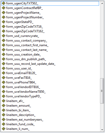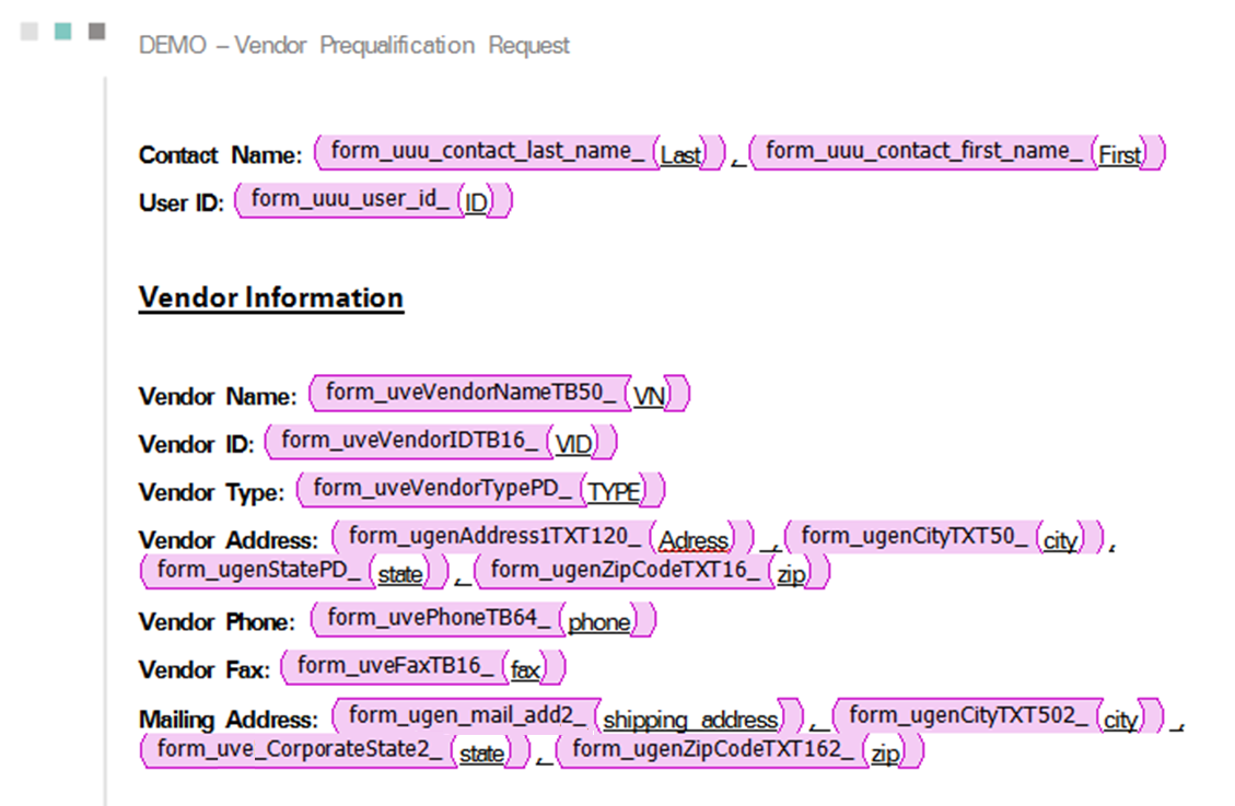 Here, the vendor pre-qualification request fields are linked to placeholders on the Word document. The contact name place holders “Last’ and “First” (separated by a comma) are linked to the data elements from the XML set on the right. Changing the style of the placeholders will change the style of the printout, as shown below with an underline.