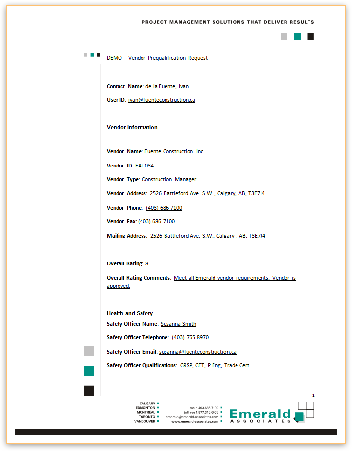 Once the Word document has been created with place holders and data element references, the file can be saved as XML and uploaded into Unifier. The layout will then be available for printing in Unifier, and will generate documents like this: