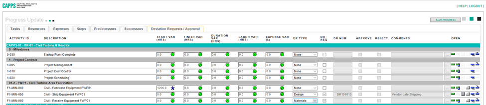 A new feature in CAPPS (Capital Project Progressing System) is the ability to request a deviation against an activity id/submit it for approval, have a DR number assigned/tracked, and also have the DR approved (or rejected) right in CAPPS (with the information stored in P6). Requesting the DR, adding the DR number to the activity in P6 and the approval process using CAPPS with the information stored in P6 makes reporting on DRs and related activity statuses very quick and easy.