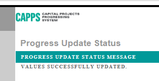 Enter the DR Type/select DR Req; then Save Progress to go to the Progress Update Status window below – When you see the screen below, your information has been sent to P6.