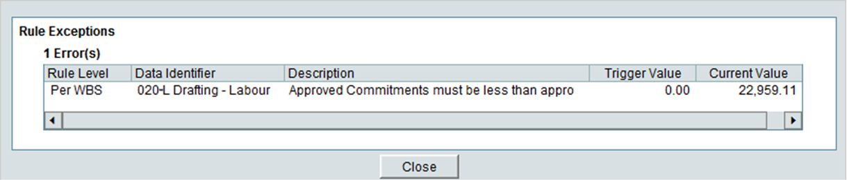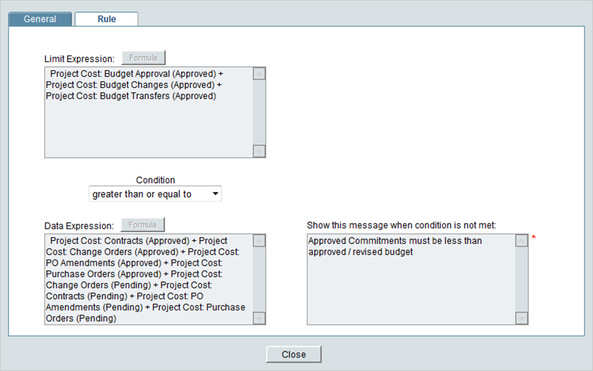 In Unifier, rules can be created which will add increased validation to business processes like contract creation. For this example, a rule is created that will not allow approved commitments to exceed the approved budget at the cost code level (WBS level).