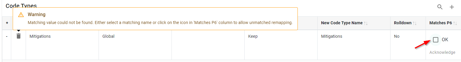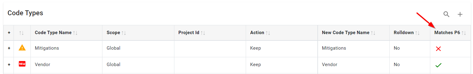 When using the Live version of P6-Scrubber, you will be alerted if the code or code value does not exist in your database. This can be overwritten by clicking the red X in the Matches P6 column and allowing the new code or value to be added.