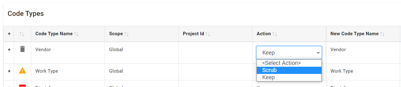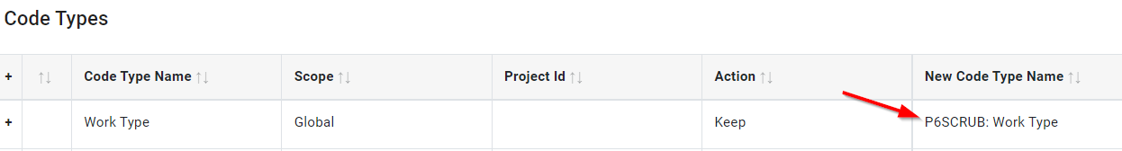 In the case where you want to keep a code and its code values, the default in the Action column is set to Keep. To rename the code type or any of the values, type the new name you want to assign, and P6-Scrubber will change the name in your file.