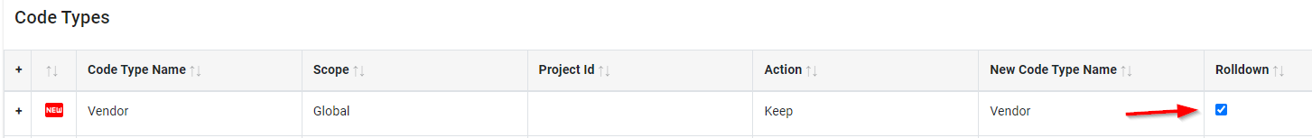 If you want to maintain a global activity code but roll it down to a project level activity code, a check can be placed in the Rolldown column. This will roll the selected activity code to the project level and reassign the code values to the project level code.