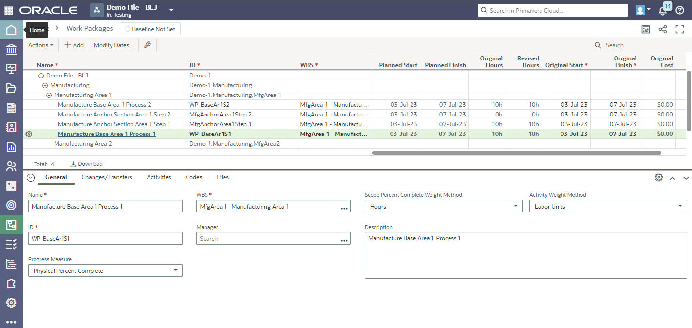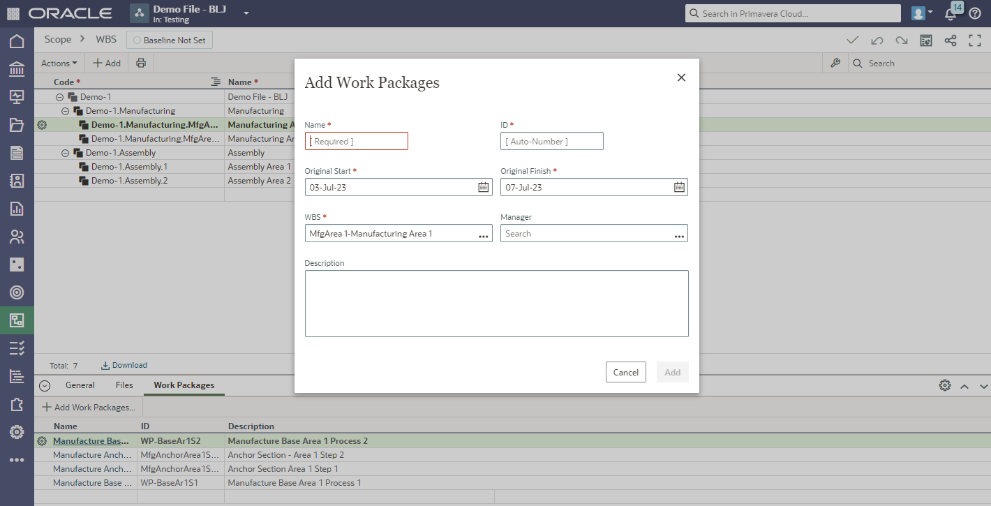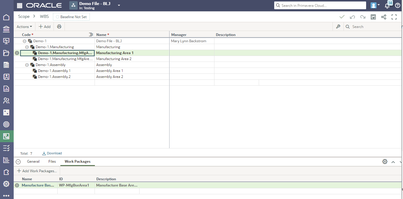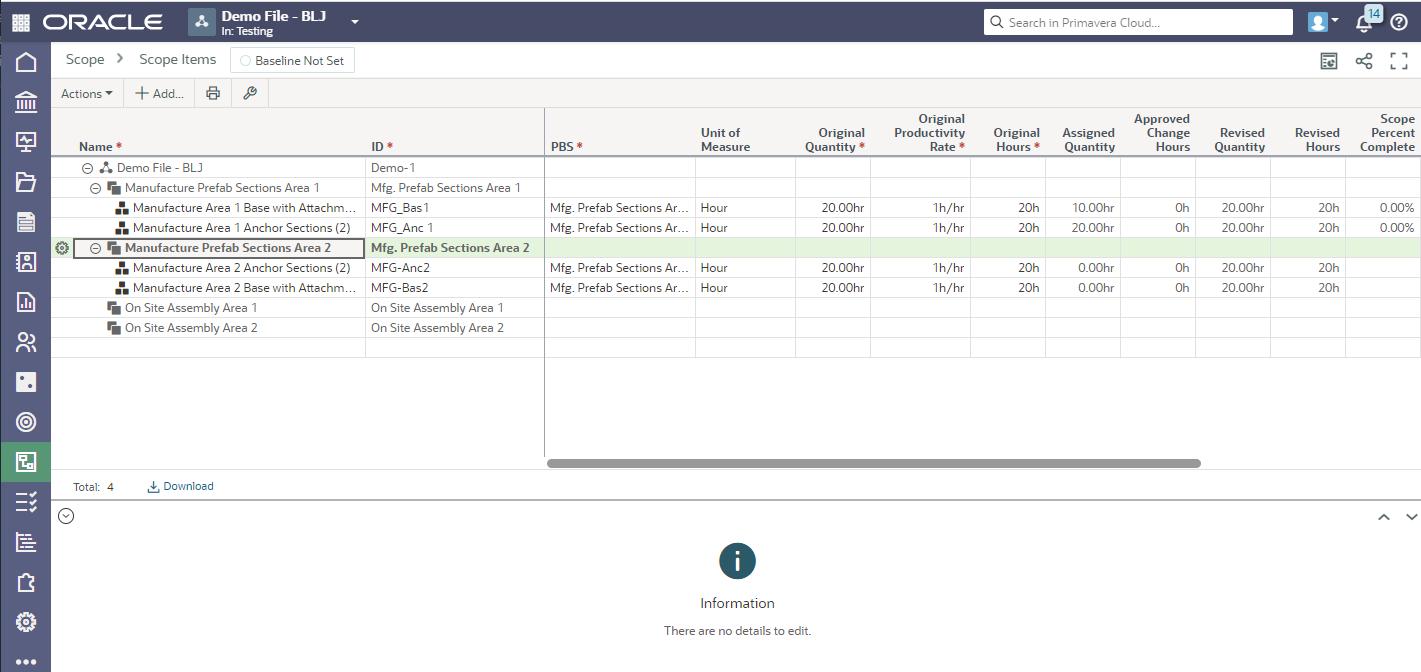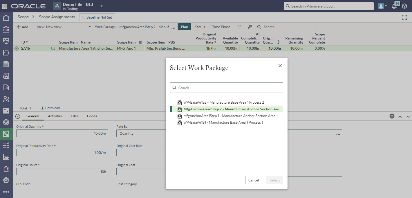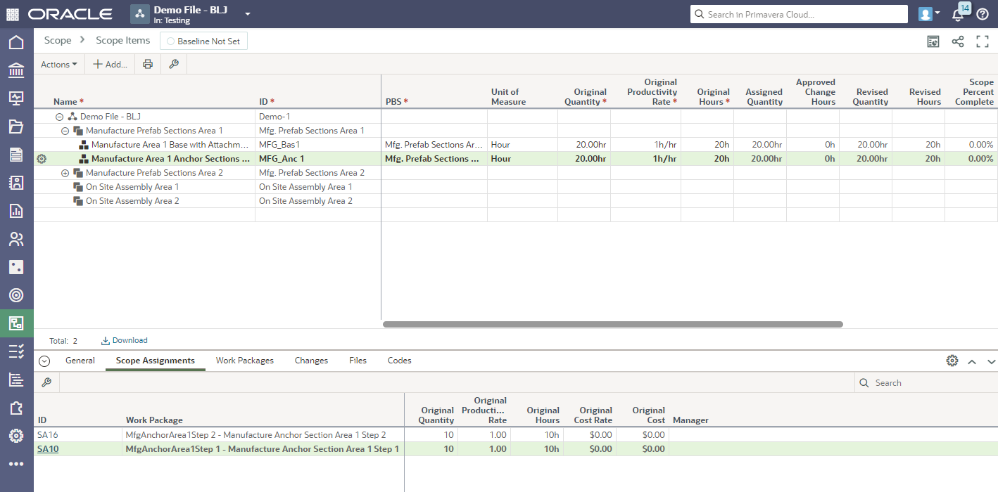 In Oracle Primavera Cloud (formerly Oracle Prime), you can create and track scope items, work packages, and WBS elements.