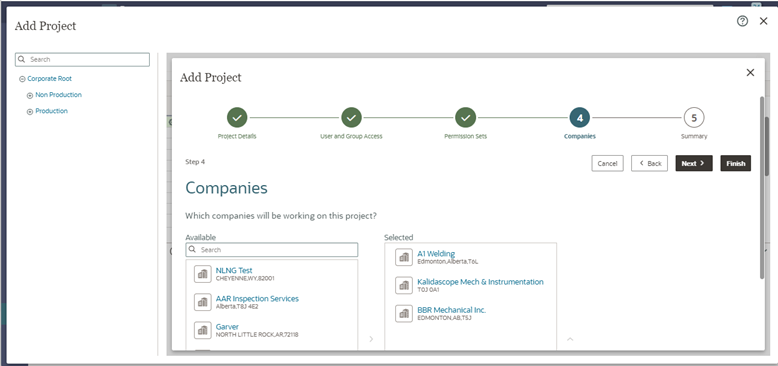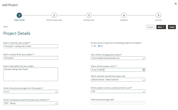 To add a project directly, we will use the Add Project wizard to add details, user and group access, permissions, and companies to the new project. A new project can be created without data, or you can copy data from an existing project or template. Keep in mind that data stored at the workspace level and relationships between projects are not available to copy.