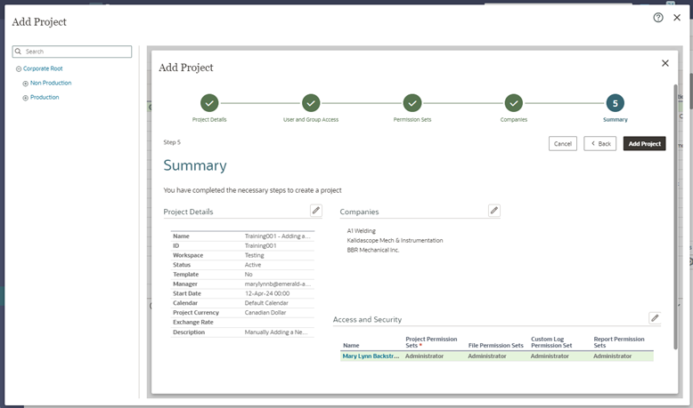 View/Review the Project Summary and click Add Project to add the project. If changes are required, click back to go back, make the changes, and then add the project.
