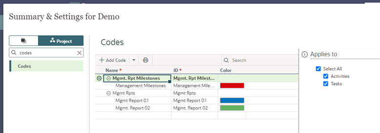 Functionality to create task codes at the project level enables you to sort, filter, and group tasks by codes on all pages available in the Task app. The code is created in Summary & Settings in the Project view. As with activity codes, colors can be assigned to the task codes. This is also available for the mobile app.