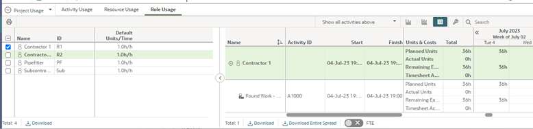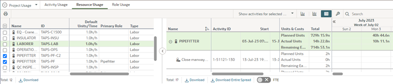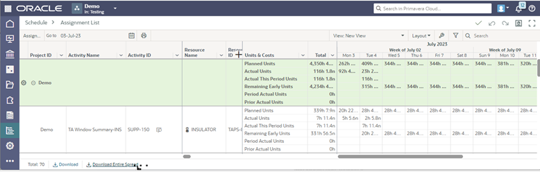 On the Assignment List page and on the Activities Resource/Role Usage tabs, a link to Download Entire Spread is now available. When the link is selected, a job service will run in the background, with a notification sent when the file is ready. The user can download the entire resource spread data to Excel for a project, workspace, or program for further reporting and analysis. The existing Download link will continue to work as before by downloading only the first fifteen columns of spread data.