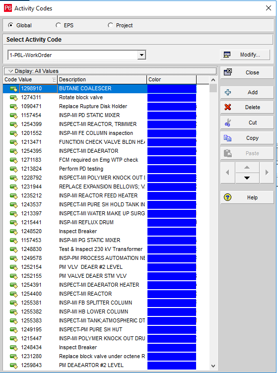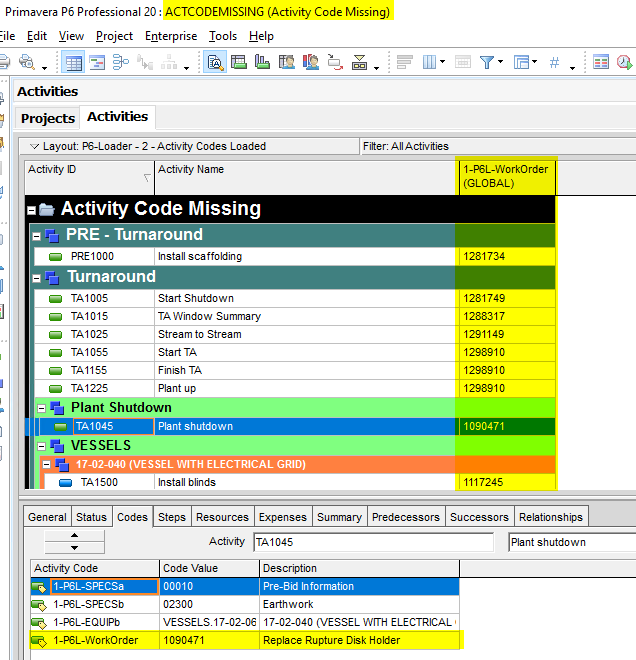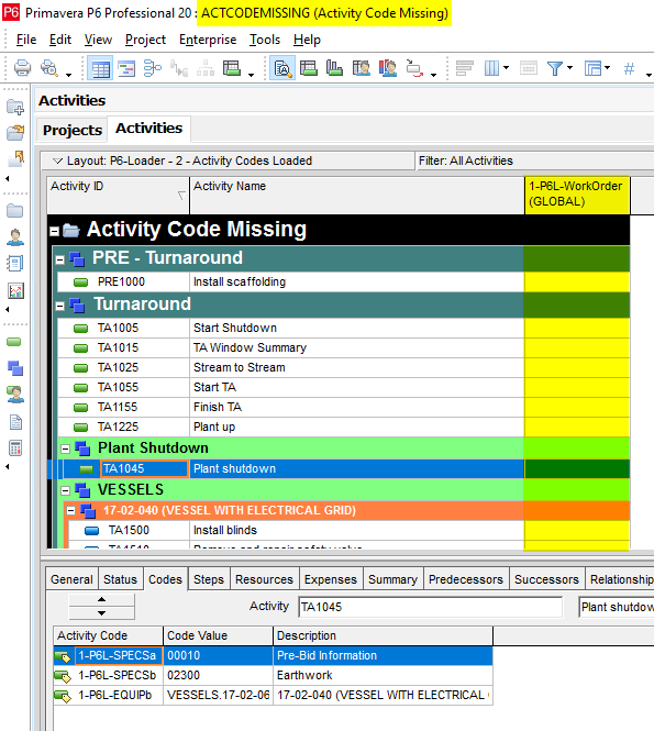 In this example, I have a project that contained an assigned value for an activity code named “1-P6-L-WorkOrder”, which is a Global Activity Code.