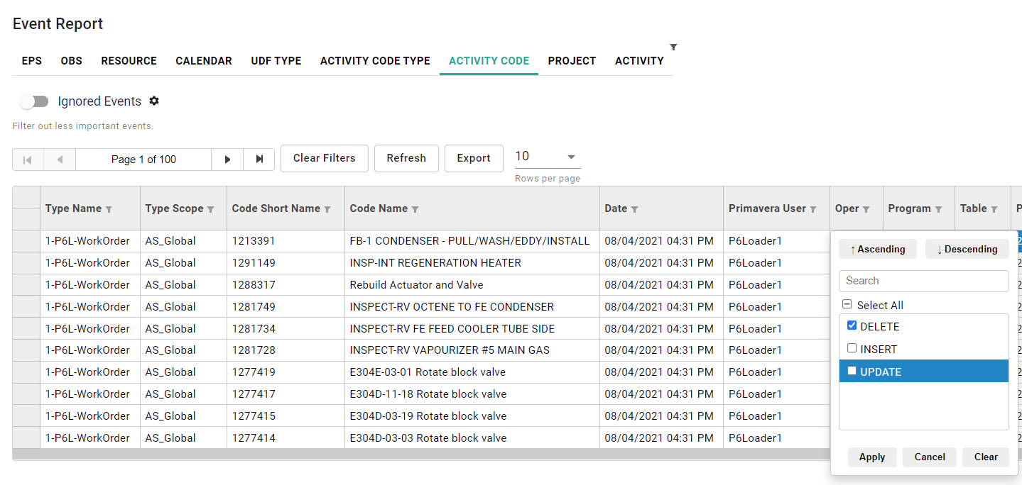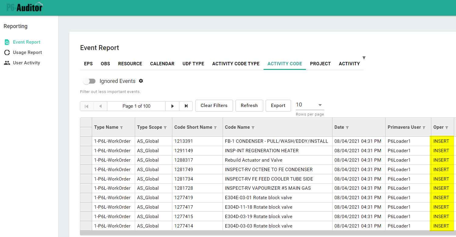 The P6-Auditor table is an easy-to-read, easy-to-maneuver spreadsheet containing the name, time, user, changed values, and operation that occurred in my activity codes.