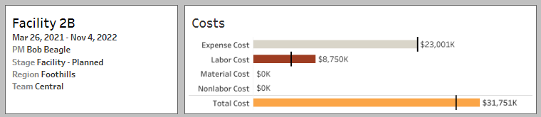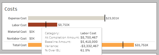 Project Details Information (top left of the dashboard) gives you project details and cost details. Place your mouse over any cost bar and a text box displays additional information (see below).