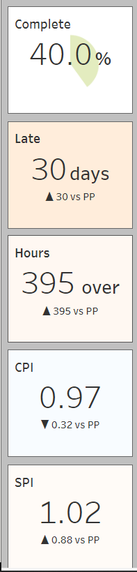 Located at the left side of the dashboard, these displays (below) provide easy access to percent complete, late status, hours (over or under as applicable), CPI and SPI for the project. The bottom four elements include a trending icon for quick reference.