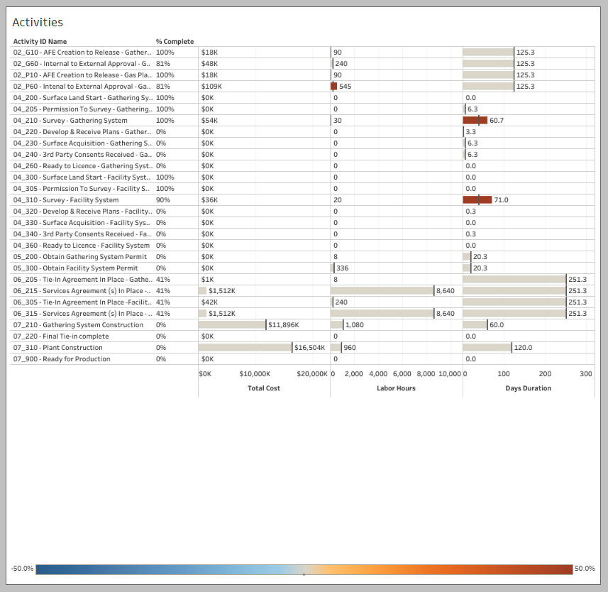 Activities percent complete, total cost, labor hours and duration (days):