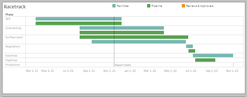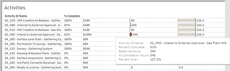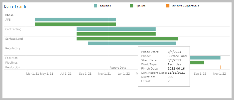 Place your mouse pointer over the Surface Land phase bar and the additional text information dialogue box displays for that roll up.