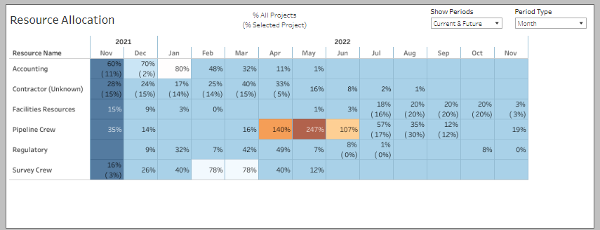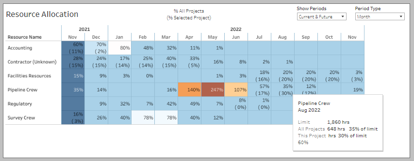 Place your mouse over the Pipeline Crew for August 2022, and you have two percentages displayed. The percentage of the available resource for all projects and the percentage of the resource availability (limit) for this specific project are displayed.