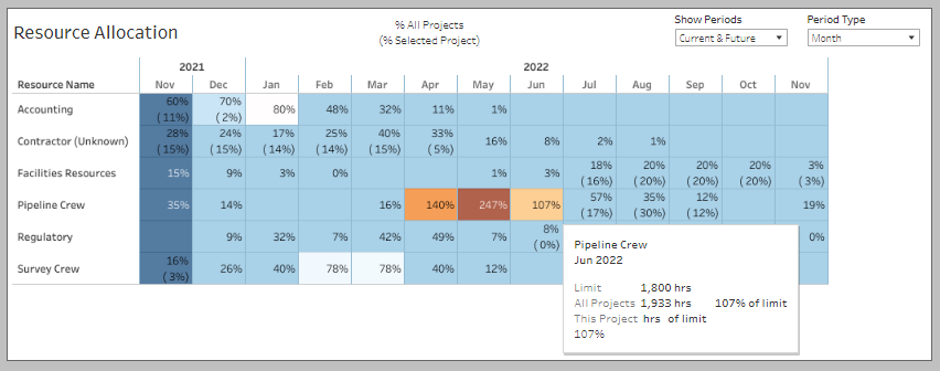 As before, simply place your mouse pointer over the Pipeline Crew resource for June 2022, and we can see in the details dialogue that the required hours are 107% of the limit for that resource. The color coding helps to draw your eye quickly to areas where you may need to investigate further.