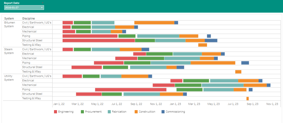 For example, the report below is grouped by System and Discipline and color coded on the type of work. Perhaps you require a report similar in display but grouped by location, sub grouped by area, and color coded showing resource concentration. Using codes and resource information from your project, you can display your project information in the format you require. You may want some additional filters which can be added with the required filters and using your project file information. Working with the coding structure in your project, the basic format creates a dashboard that gives your project group current information in an easy-to-digest format, showing exactly what they require.