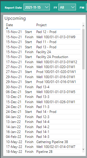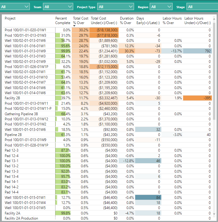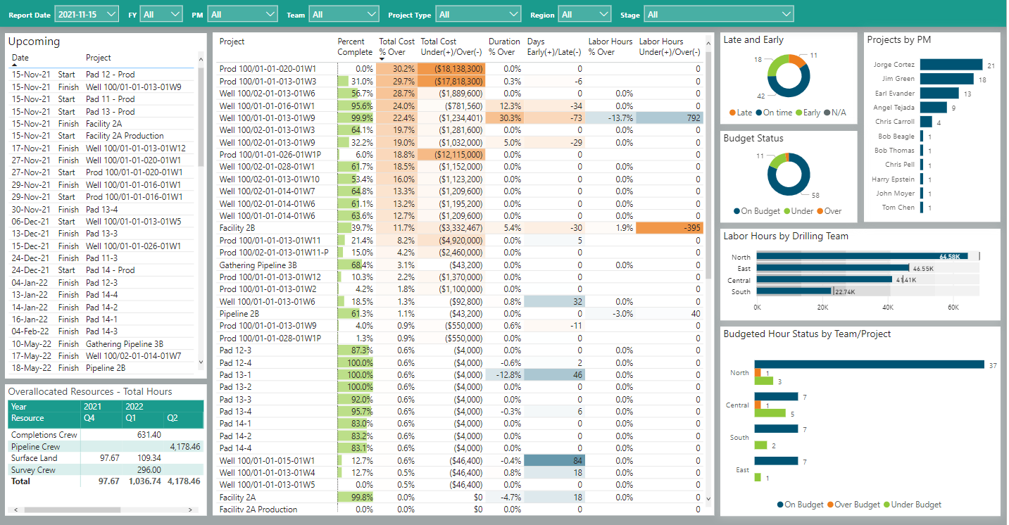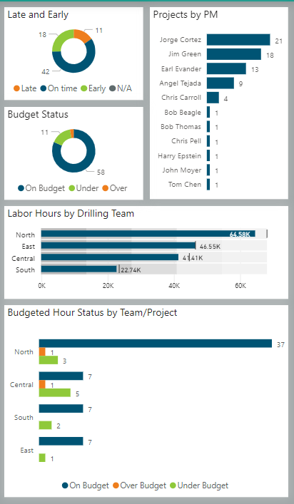 The portlets on the right side of the self-serve dashboard reflect the overall status of the portfolio projects by time, budget status, the number of projects being managed by each project manager, labor hours on the overall projects by Drilling Teams (the demo projects being used are drilling projects), and Budgeted Hour Status by Team/Project. Keep in mind the interactive side of the dashboard both by clicking to select a specific project in the project list but also using the filters available at the top of the dashboard.