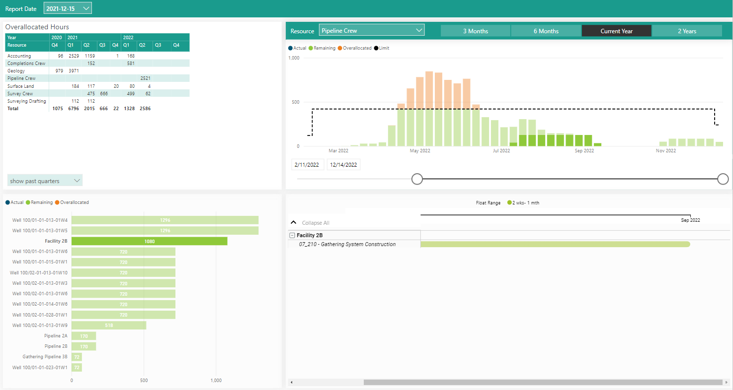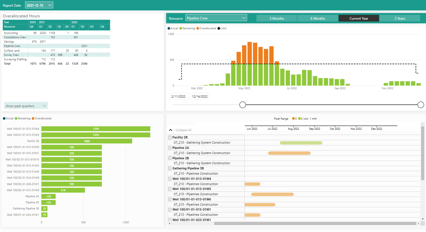 The Resource Allocation dashboard above is displayed in Power BI. Again, you can compare snap shots. You can also filter the resource you want to review using the filters and timeline configuration available above the resource profile. The projects and activities with that resource assigned are displayed in the bottom dashboard portlets.