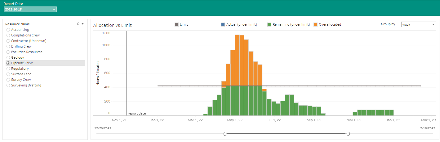 P6-Reporter resource profiles are available in a dashboard with portlets showing other resource related information using Tableau or Power BI. The self-serve dashboards provide filtering and an interactive information display when selecting specific pieces of information within the dashboard. The above screen shot is from Tableau.