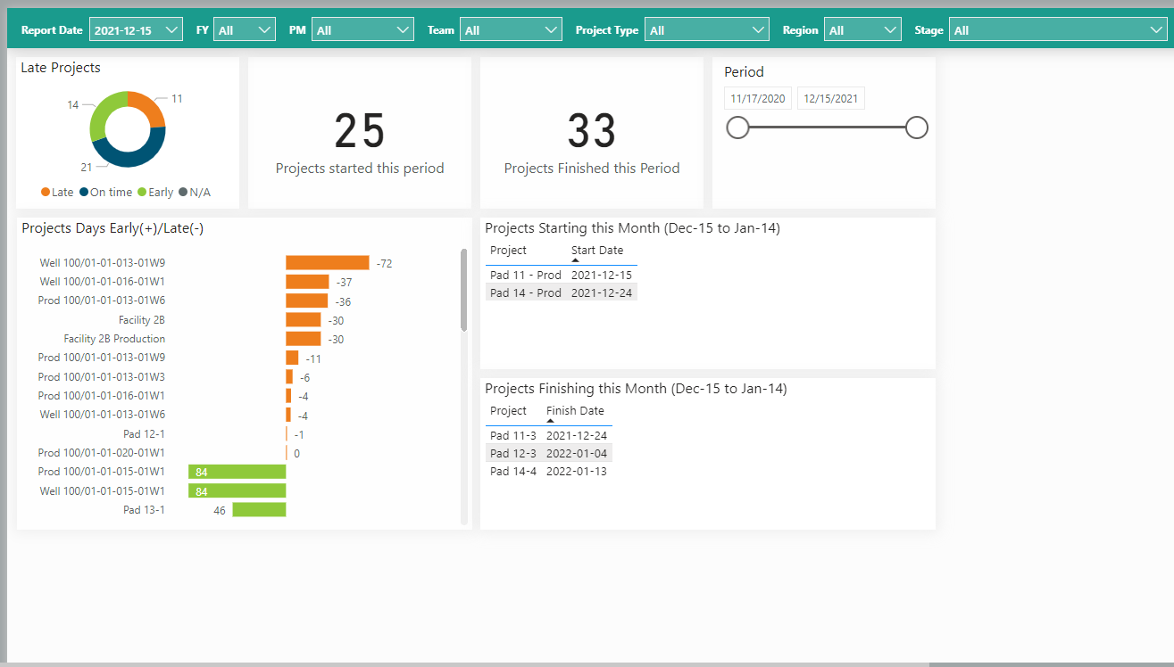 Let’s walk through an example; just a small example of what is available. My portfolio of projects is being reported in dashboards in Power BI, so what is the advantage? To start, I can easily see that I have 11 projects tracking late – we will look into this closer. I have 14 projects tracking early, and 21 projects on time. Projects starting and projects finishing this month are listed for me as well. All this information is ready and can be consumed at a glance. (In this example, the latest snapshot is Dec 15.)