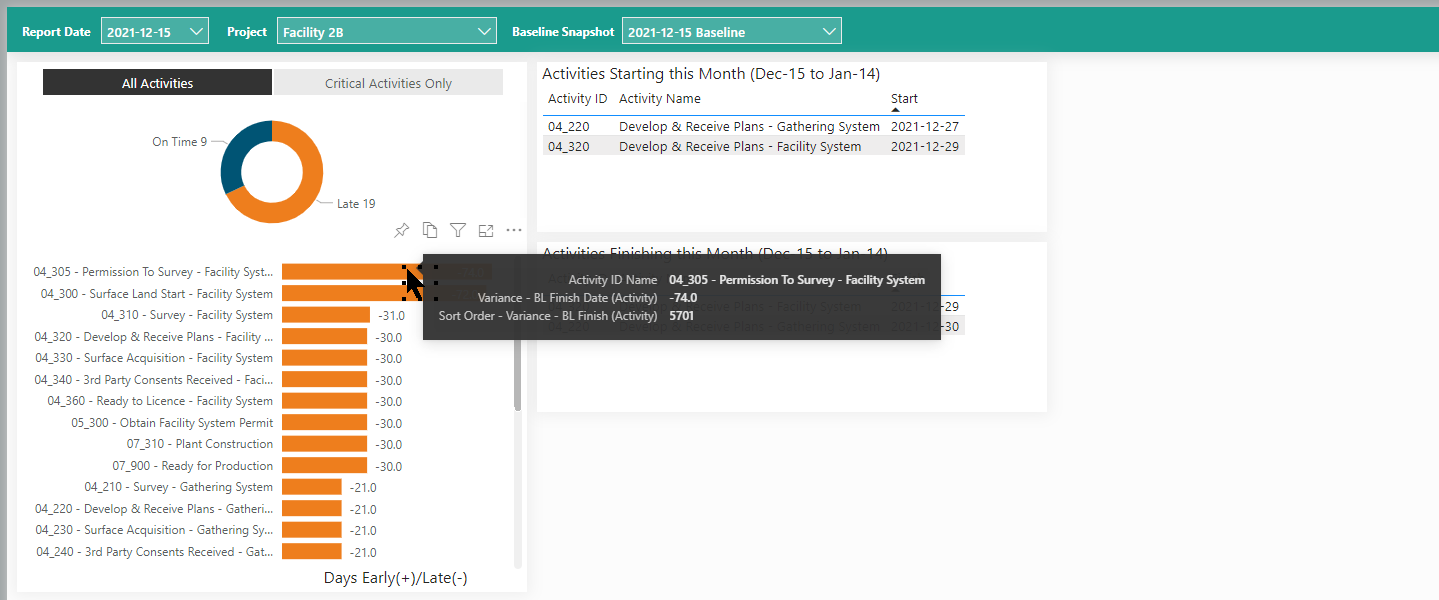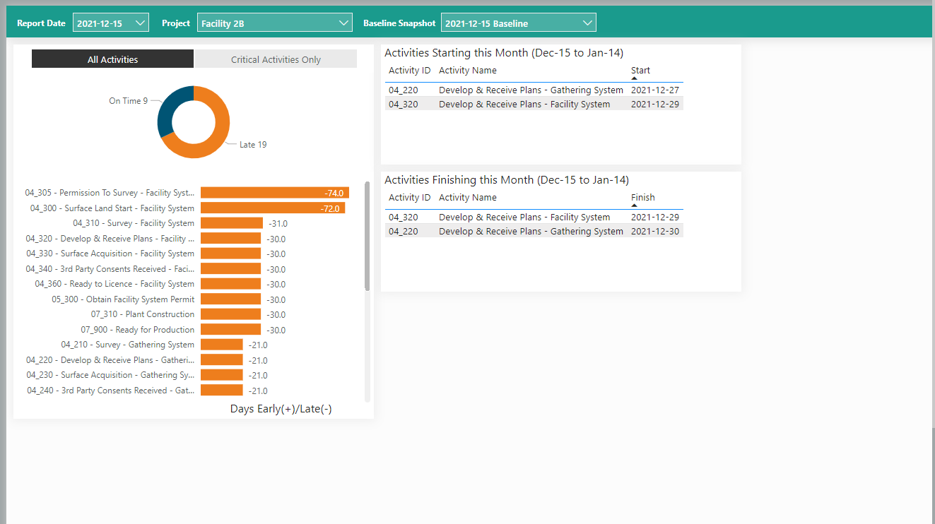 A quick click to the project activities dashboard allows access to specific project activity status and activities scheduled to start and finish in the next month.