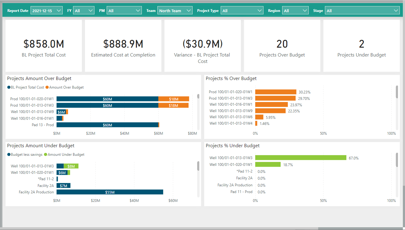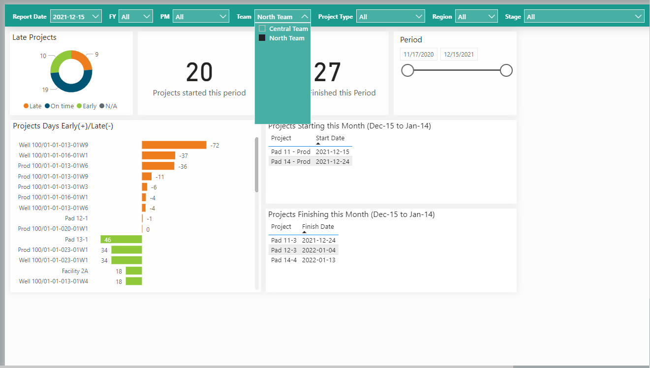 Simple menu selections in the dashboard allow easy navigation to see how the North Team is doing. Out of the 11 late projects in my portfolio, 9 have a North Team Assignment. Nineteen of the 21 on time projects have that same team assigned, along with 10 of the 14 projects tracking early. Perhaps a Team Assignment filter does not give us all the information we need, so we can slice and dice the portfolio information using any of the filters at the top of the dashboard.
