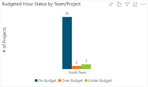 At a glance, we can see that out of 38 projects for the North Team, 2 are over budget hours, 2 under budget hours and 33 on budget hours.