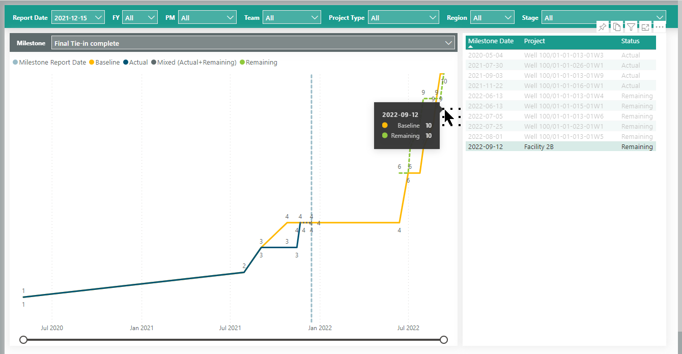 Project milestones are available for review. Easy access to checking where there are any issues that may require further investigation. Easily select the filter(s) required, and the information we require is at our fingertips.