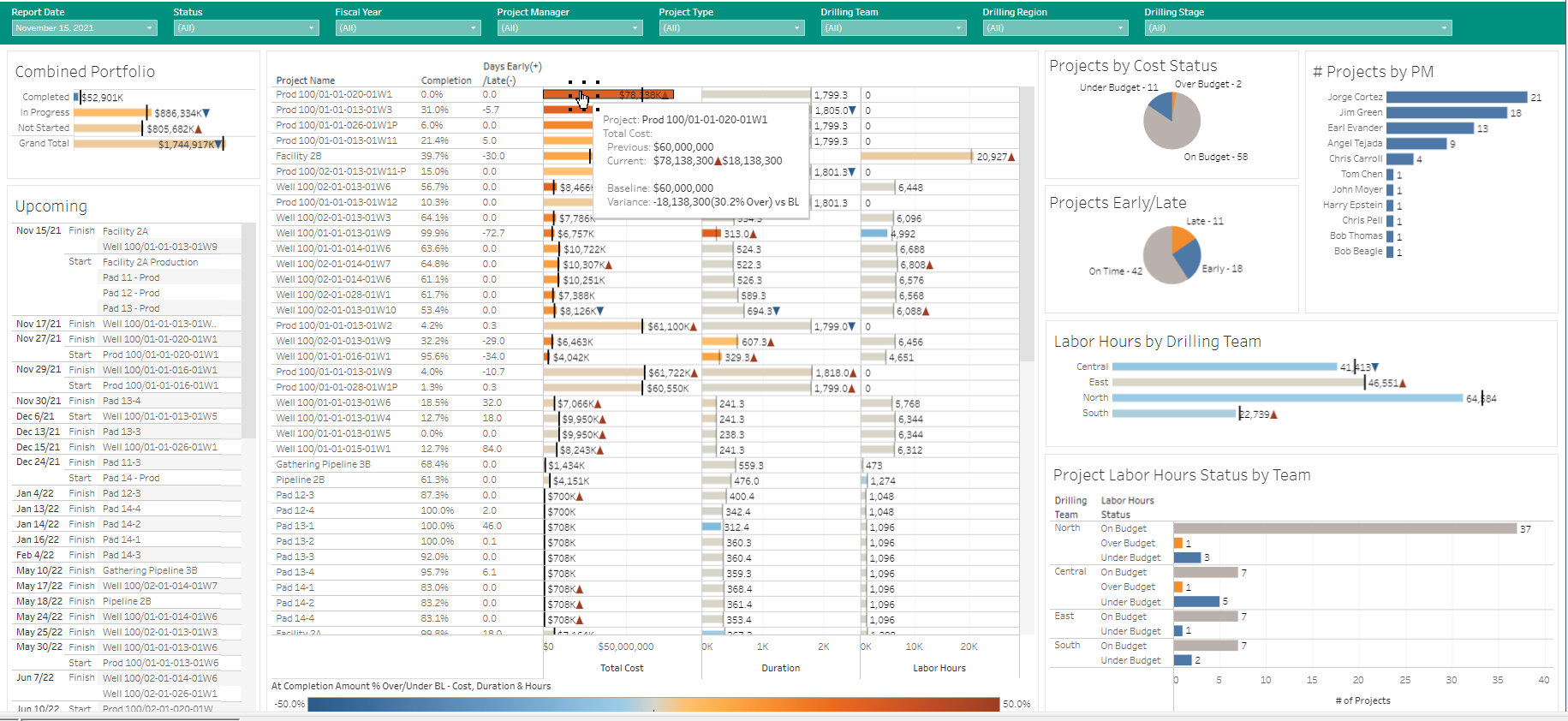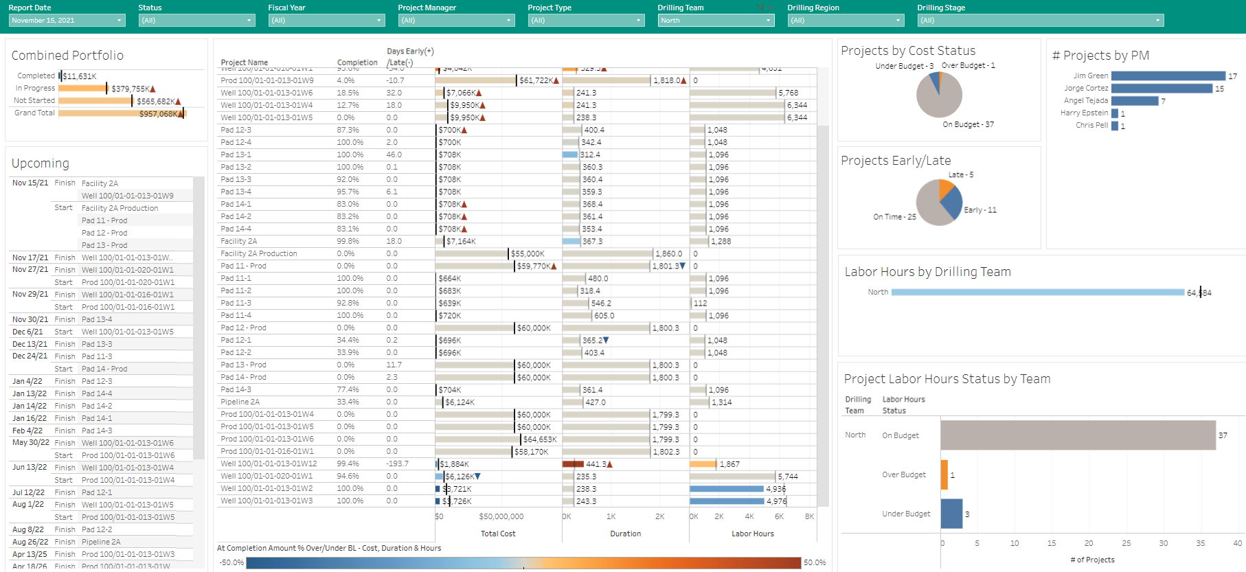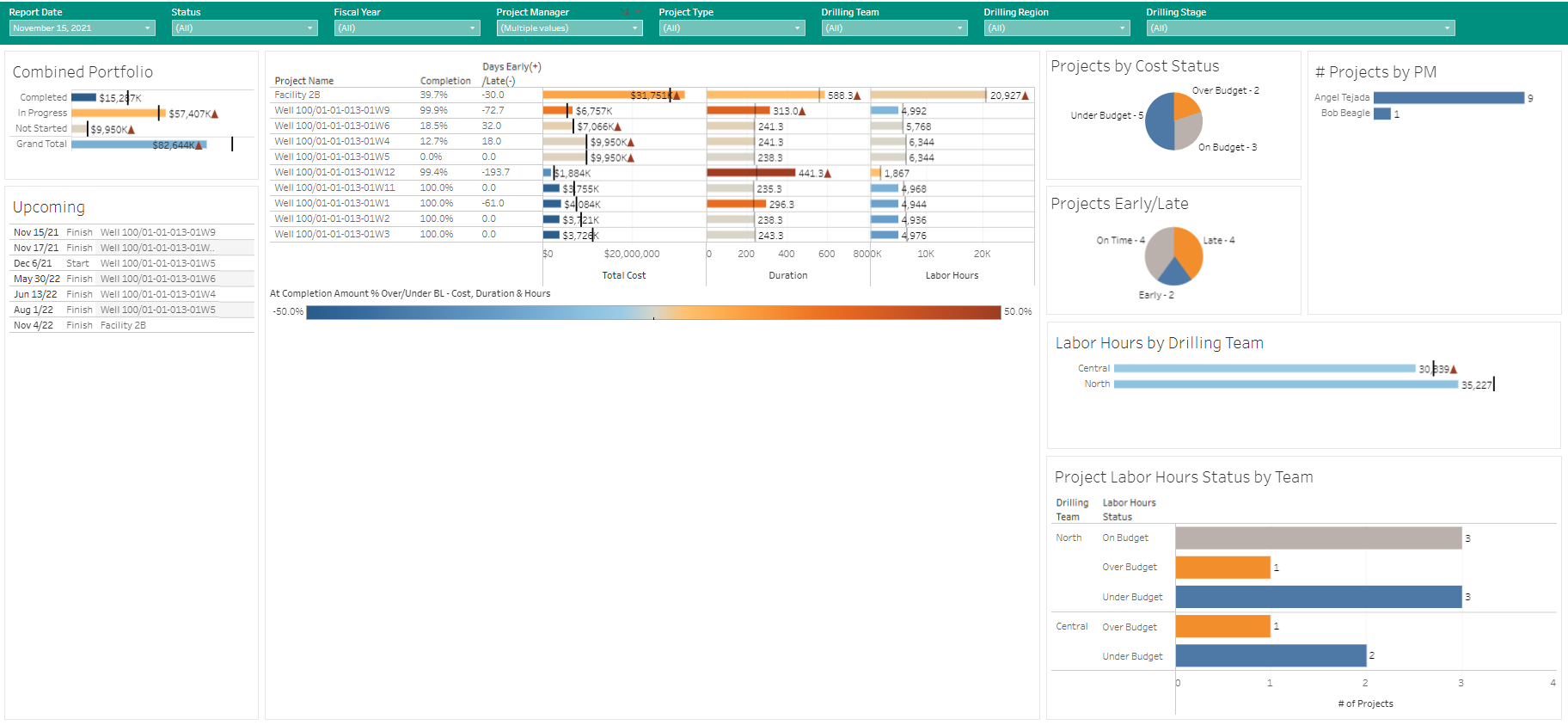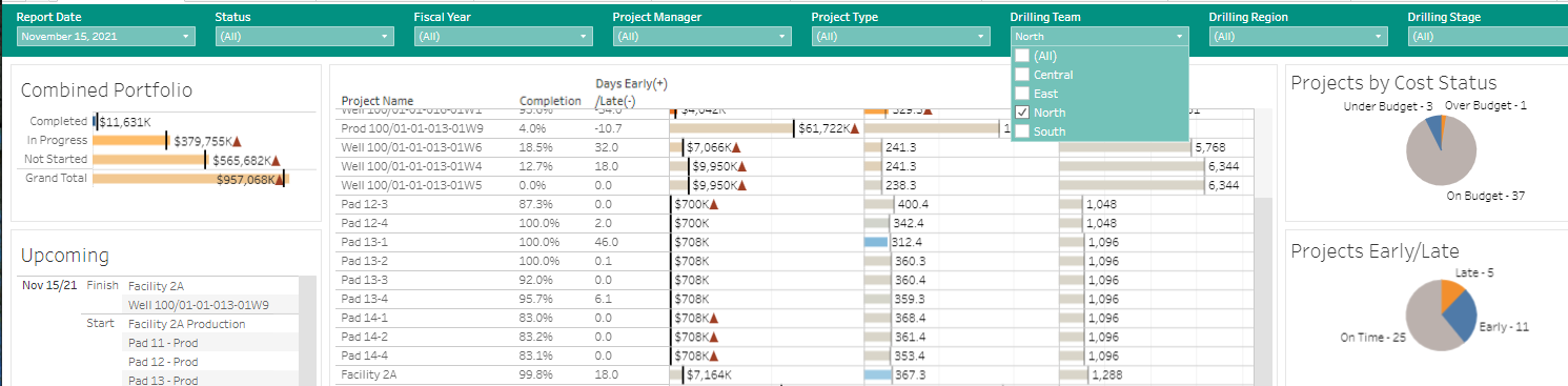 In the screen shot below, the project manager selection has been changed back to display the entire portfolio, but only the North drilling team has been selected now for display.
