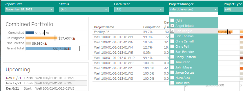 Setting the Project Manager filter to display just the first two project managers (for example) is easily completed by clicking the filter drop down and making the required selections. (Multiple filter criteria can be set for a display.) Only the projects for the two Project Managers selected are displayed in the dashboard in the second screenshot below.