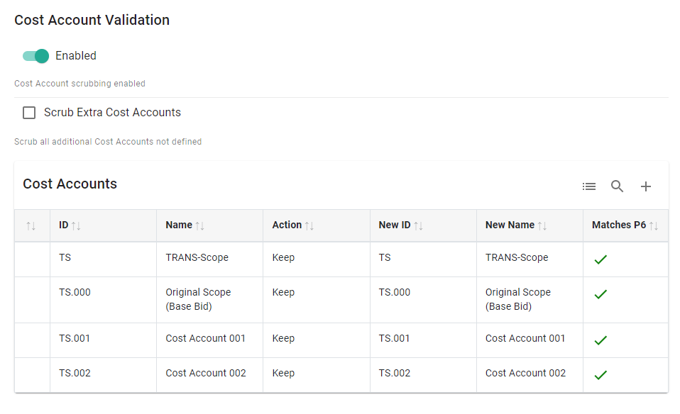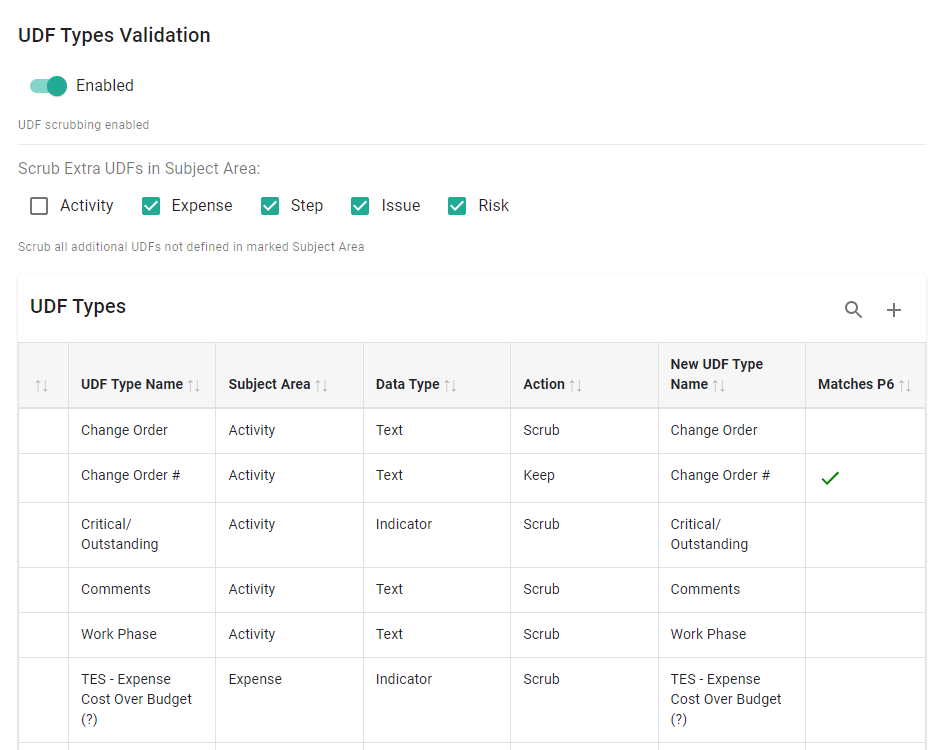 UDFs at all subject levels can be checked. They may be kept or scrubbed out of an XER/XML, remapped and verified with live data from your existing database. Extra UDFs can be scrubbed from the file by simply checking a box. Cost accounts can be defined and checked and/or removed just as easily.