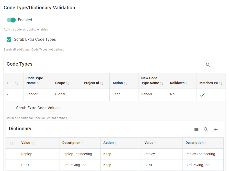 Project, Activity and Resource Codes Types and Values can be defined. Codes and Values may be kept or scrubbed out of an XER/XML, remapped and verified with live data from your existing database. Once a definition is saved, you can also remove any undefined codes or values that come in that are undefined. It is easy to populate the definitions with a bulk add option that can accept values copied directly out of your P6 dictionaries or you can import an existing XER/XML to determine what type of data is in the file already.
