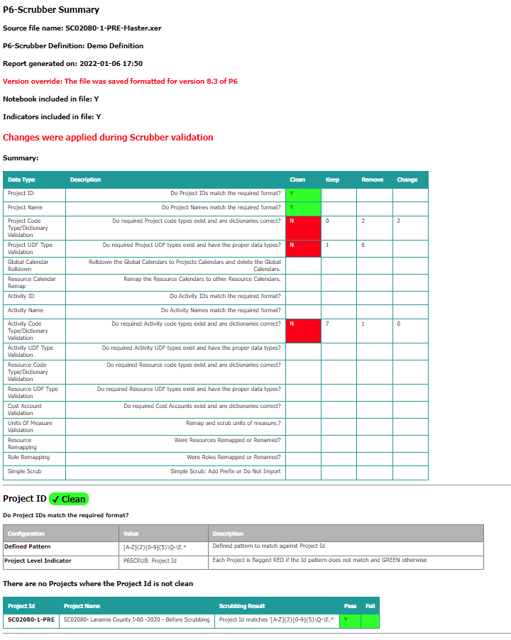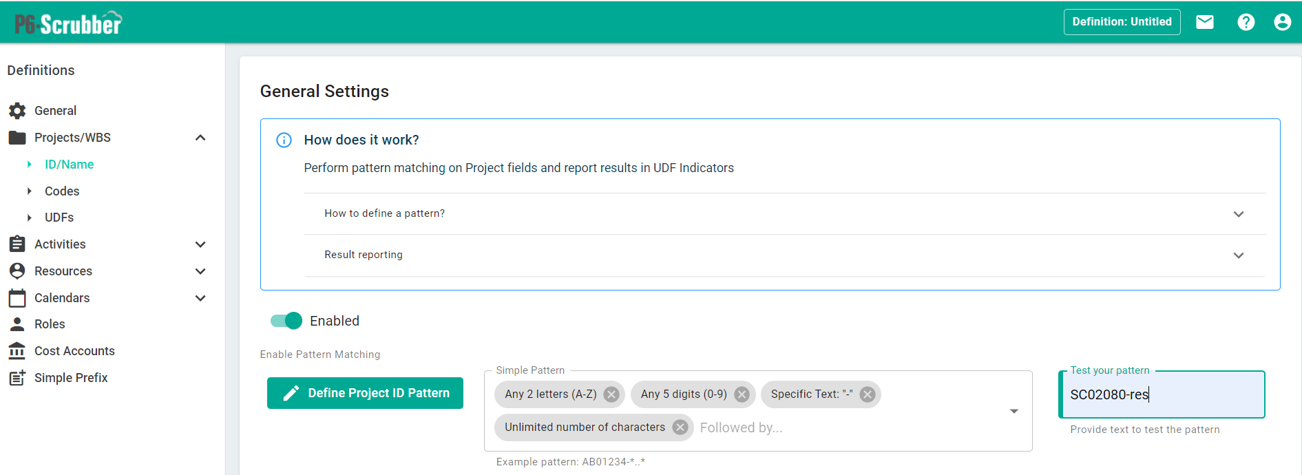 P6-Scrubber can check project and activity IDs and names for adherence to your specifications set for your contractors. Our easy to use pattern definer will walk you through setting up the patterns and allow you to validate the IDs and Name according to your specs prior to running it on your XER/XML.