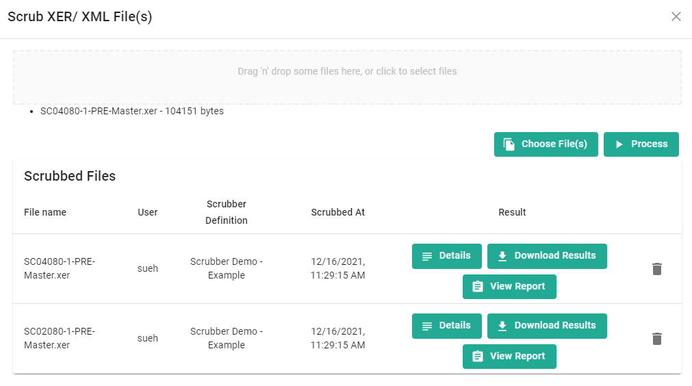 To scrub an XER/XML, you need to only choose a Scrubber Definition and one or many files to scrub. The P6-Scrubber will scrub each file according to the definition and supply an output of a clean file with indicators signifying if changes were made and an html report documenting everything the scrubber did with the data. The indicator and report creation in the clean XER/XML file can be turned off if you do not want to include them in your import. There is also an option to produce an XER file with a lower version to accommodate those files from a company that may use a more recent version of P6 than yours.