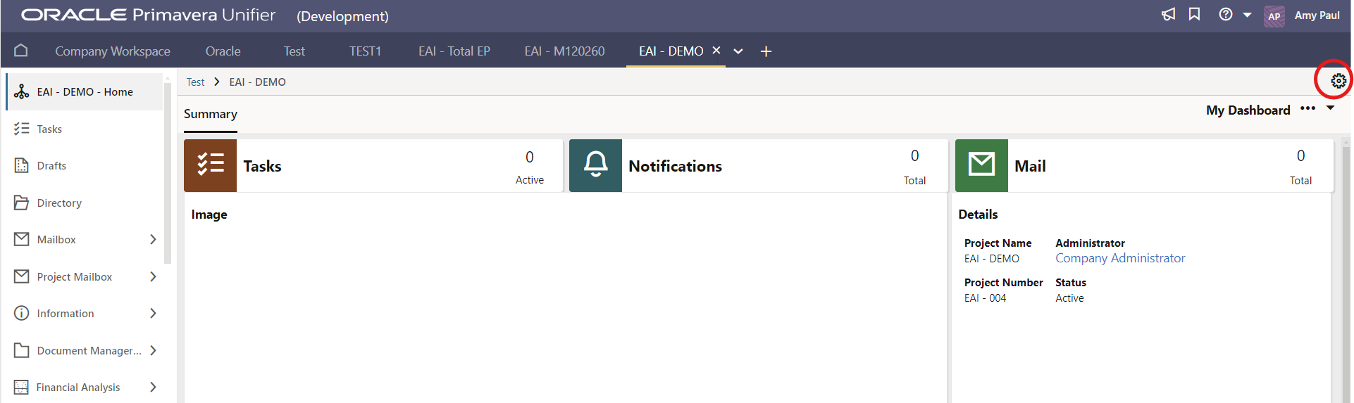 Once you are in the correct project shell, make sure that you are in user mode which you can check by the colour of the gear in the top right corner: blue for administration mode and black/grey for user mode (simply click it to switch modes, if you have administration access).